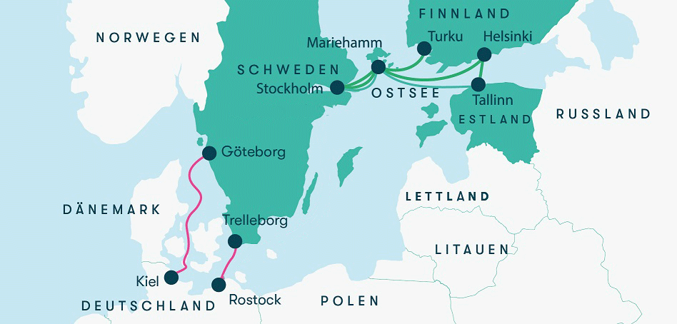 Mit Stena Line resit Du von Deutschland (Kiel bzw. Rostock) nach Schweden (Göteborg bzw. Trelleborg). Und von Stockholm aus geht es weiter mit Tallink Silja zu den Destinationen: Helsinki, Turku und Tallinn.