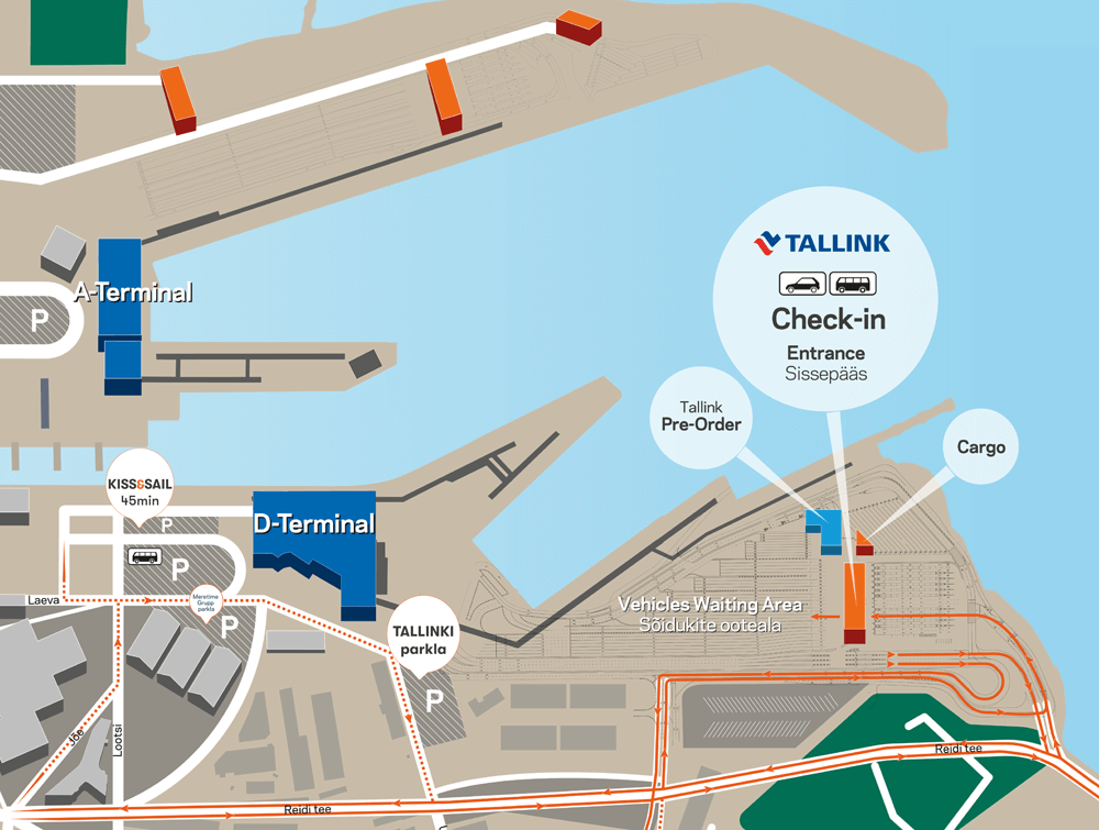 タリン港のターミナルDでは、新しいスマートポート(Tark Sadam)電子ソリューションが車両交通管理に使用されている。この電子ソリューションでは、自動車のナンバープレート自動認識機能により、港湾区域へのバリアが自動的に開かれ、港湾内の電光掲示板がドライバーを船まで簡単に誘導します。